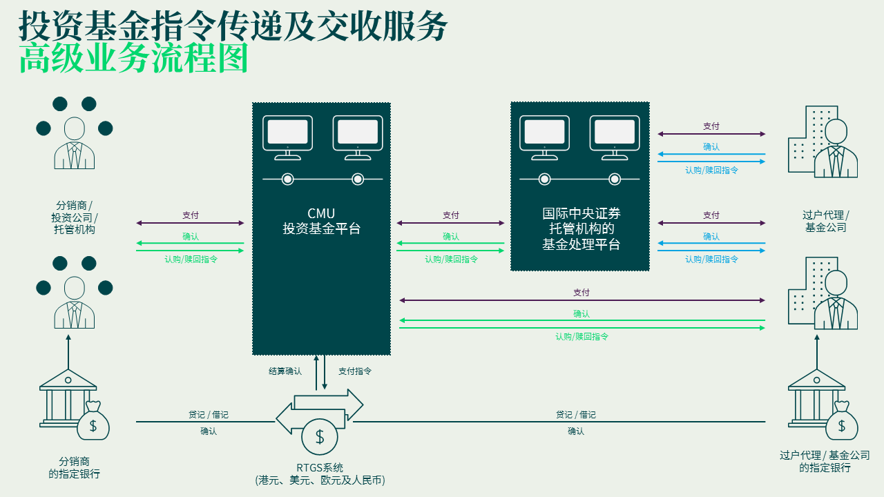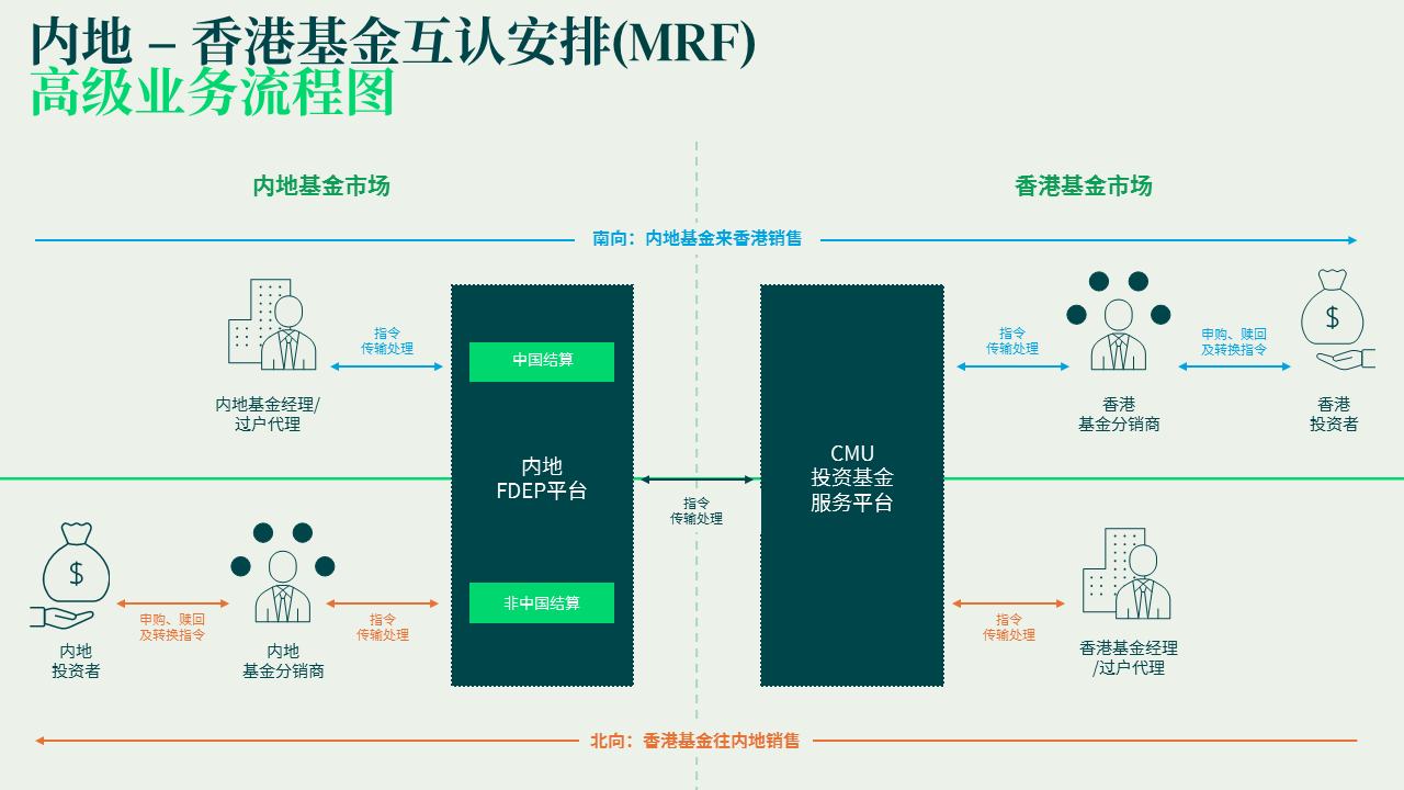 自2015年7月推出 MRF 后,合资格的内地及香港认可基金可于彼此市场向零售投资者分销。CMU亦与内地的过户代理(TA)及基金公司(FH),包括中国证券登记结算有限责任公司(中国结算)建立联系,使基金指令得以自动化且高效处理,于跨境交易中开拓无限商机。